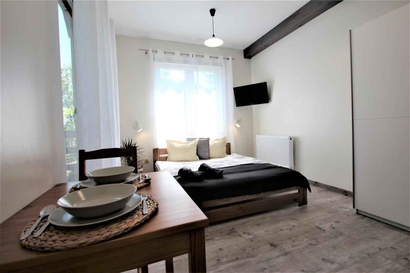 Studio. Guests will find a stovetop, a refrigerator, kitchenware and a microwave in the well-equipped kitchenette. The studio also features a barbecue. This studio is comprised of a flat-screen TV with cable channels, a private bathroom as well as a terrace with garden views. The unit has 3 beds. Studio - 4 osobowy. Powierzchnia pokoju ok.: 25 mkw. ;